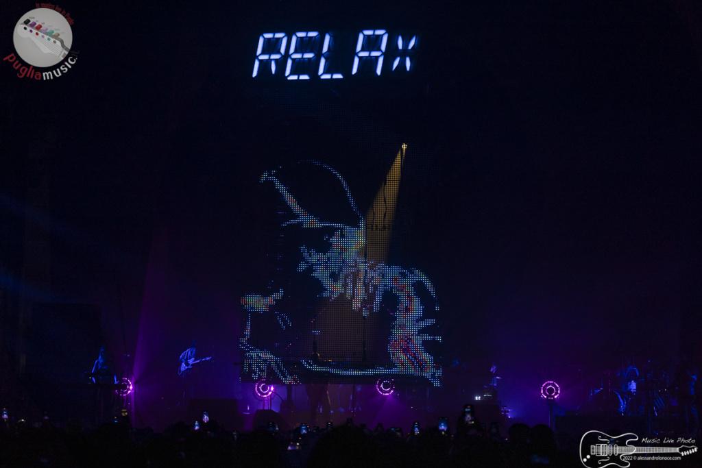 Un concerto luminoso, quasi ipnotico sul cui palco una serie di schermi trasmettono immagini, colori, rappresentazioni grafiche e non del senso delle canzoni che si alternano creando uno spettacolo coinvolgente anche nello sguardo oltre che nell’ascolto.