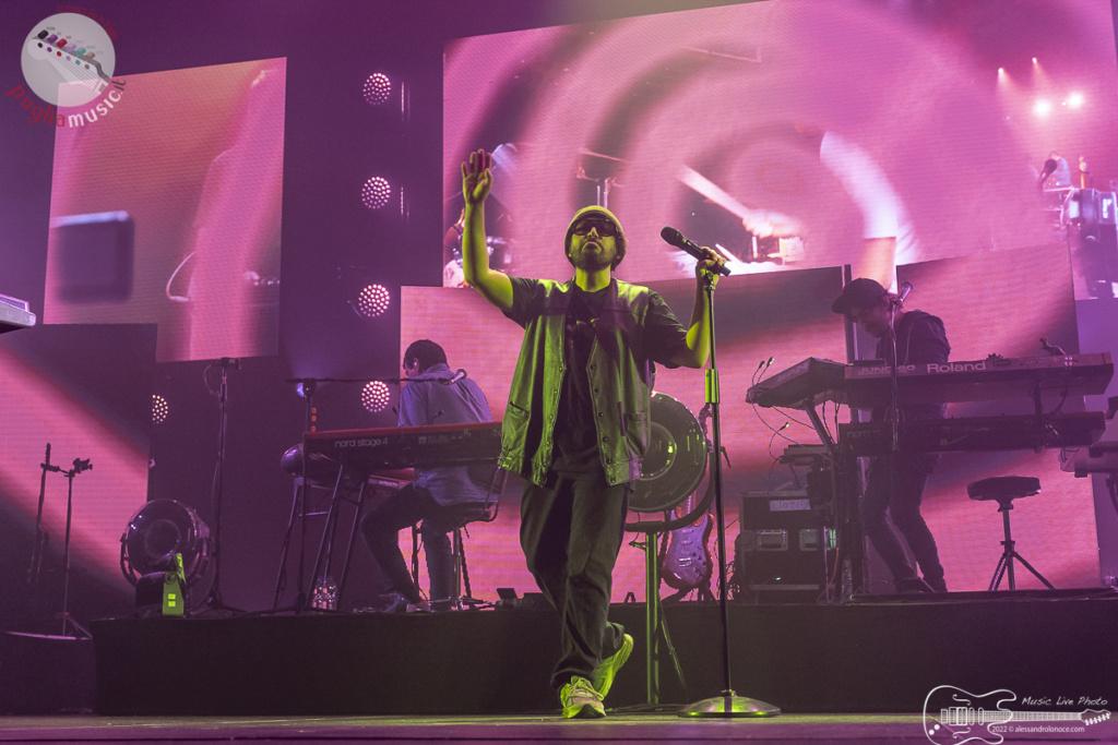 Un concerto luminoso, quasi ipnotico sul cui palco una serie di schermi trasmettono immagini, colori, rappresentazioni grafiche e non del senso delle canzoni che si alternano creando uno spettacolo coinvolgente anche nello sguardo oltre che nell’ascolto.