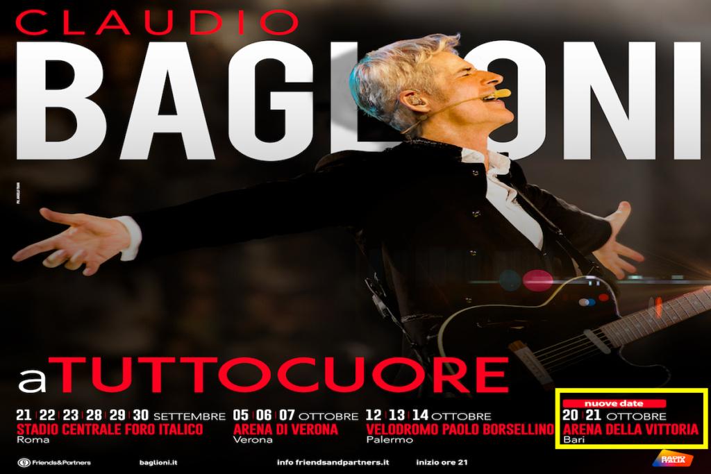 Dopo il grande successo delle prime 12 date annunciate, “aTUTTOCUORE”, i maxieventi di Claudio Baglioni, si arricchiscono di 2 nuove date all’ARENA DELLA VITTORIA di BARI, il 20 e 21 ottobre 2023.