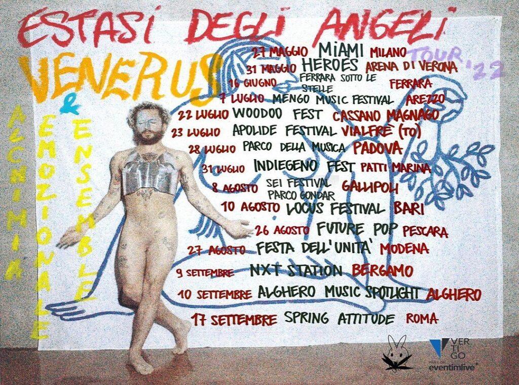Venerus è attualmente impegnato con il nuovo tour “Estasi degli angeli”, che lo vedrà impegnato nei principali festival estivi italiani.