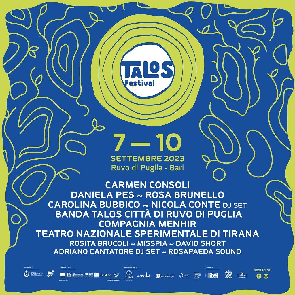 Talos Festival 2023 è un progetto promosso dal Comune di Ruvo di Puglia, diretto e organizzato in partnership con Bass Culture srl, in collaborazione con Teatro Pubblico Pugliese, cofinanziato da Regione Puglia a valere sulle risorse di cui al POR PUGLIA 2014-2020–Asse VI-Azione 6.8–Piano Strategico del Turismo–Asse VI–Azione 8 “Interventi per il posizionamento competitivo delle destinazioni turistiche”–Progetto “Comunicazione digitale e Brand Identity della destinazione Puglia” destinate anche all’attuazione dell’Accordo di Cooperazione tra TPP e ARET Puglia Promozione Intervento Attuativo n. 1/2023 “PALINSESTO 2023”.