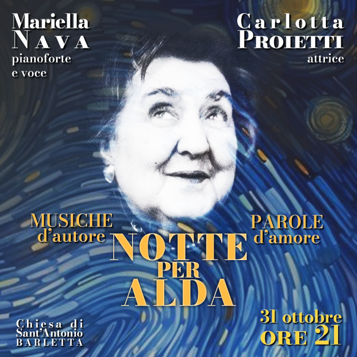 In più di 25 anni di attività, l’associazione andriese ci ha abituati ad appuntamenti di altissimo profilo che coinvolgono artisti e personalità di spicco del mondo dello spettacolo e della cultura. Non differisce “Notte per Alda“, in programma il prossimo 31 ottobre, dalle ore 21:00, nella suggestiva Chiesa di Sant’Antonio a Barletta (BT).