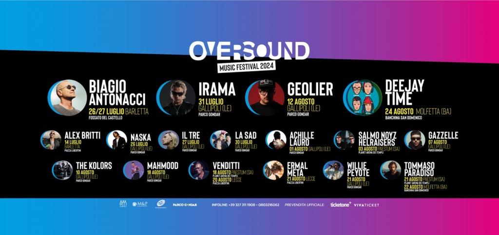 Oversound Music Festival, giunto alla sua quarta edizione, ritorna nelle affascinanti location di Puglia e Campania con i più amati artisti del panorama musicale italiano: Alex Britti, Biagio Antonacci, Naska, Il Tre, La Sad, Irama, Achille Lauro, Salmo & Noyz, Gazzelle, The Kolors, Geolier, Mahmood, Antonello Venditti, Ermal Meta, Tommaso Paradiso, Willie Peyote, DeejayTime (Albertino, Fargetta, Molella, Prezioso).